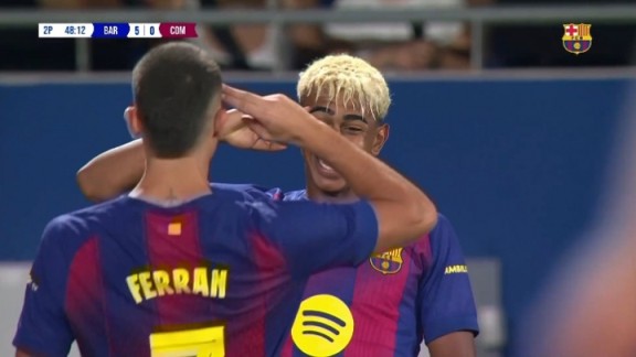 08月11日讯 甘伯杯巴萨vs科莫第48分钟,亚马尔兜射破门,本场达成双响,随后做拉什福德经典庆祝动作,巴萨5-0领先科莫!