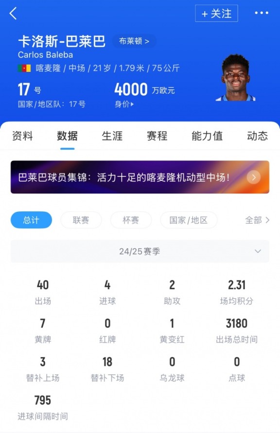 据此前多家媒体消息,曼联有意签下巴莱巴,这位21岁的喀麦隆中场目前德转身价为4000万欧元。