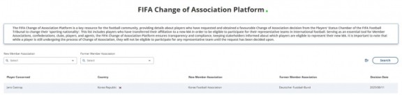 韩国归化!FIFA官网显示:22岁门兴中场卡斯特罗普会籍变更为韩国