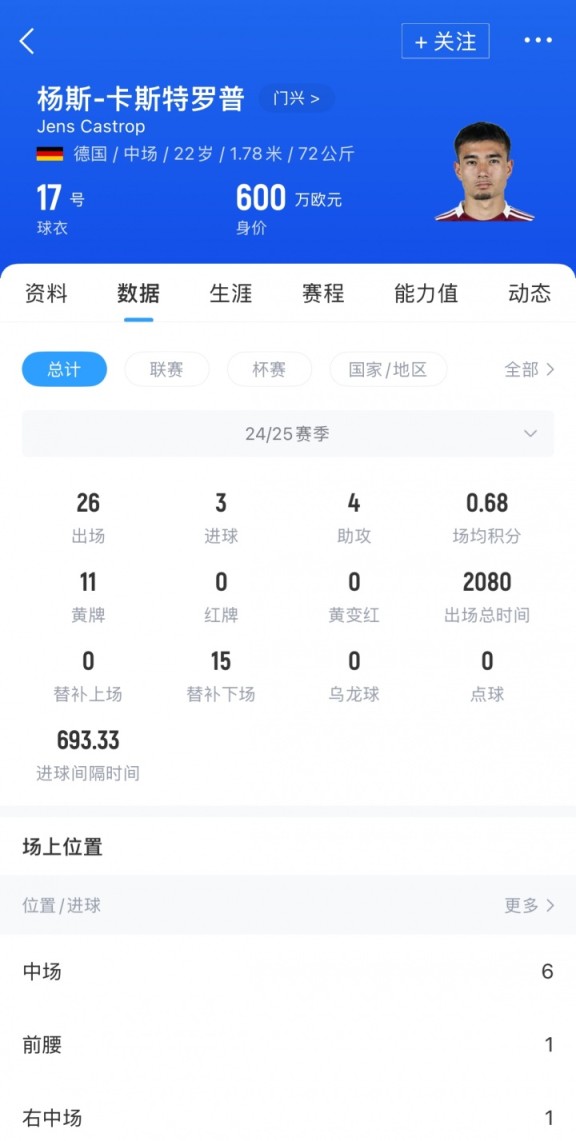 卡斯特罗普是韩国与德国混血,身高178,司职中场。球员德转身价600万欧,今年夏窗以450万欧转会费从纽伦堡加盟门兴。