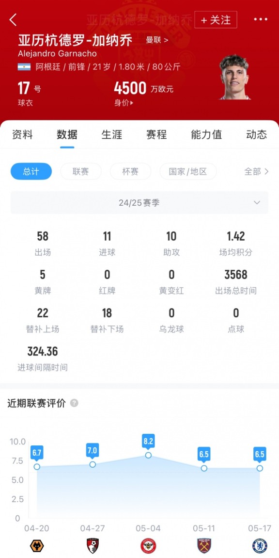 加纳乔现年21岁,与曼联合同2028年到期,球员当前身价4500万欧,上赛季各项赛事代表曼联58场11球10助。