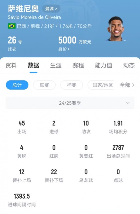 21岁的萨维尼奥上赛季为曼城出战45场,贡献2球10助攻。球员目前的德转身价为5000万欧元。
