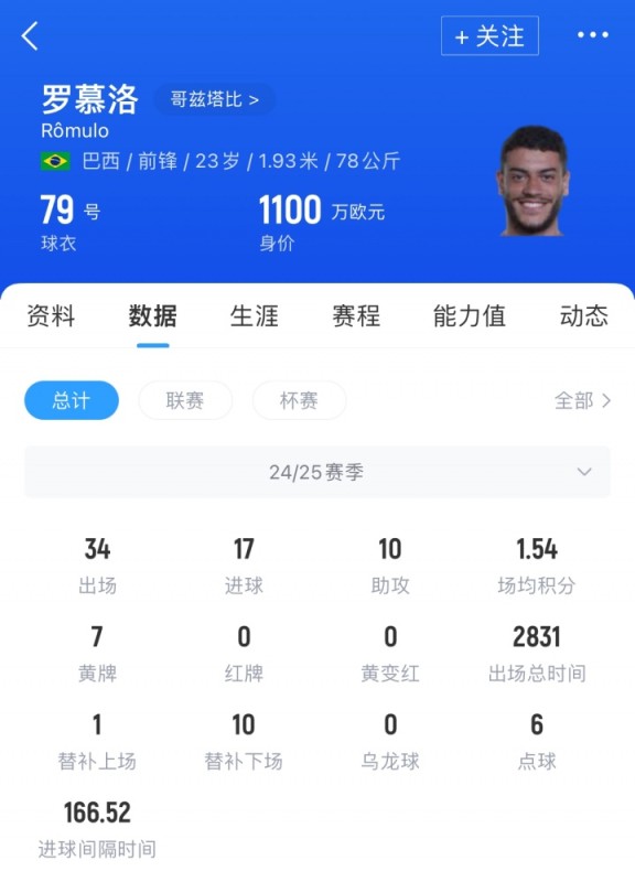 23岁巴西前锋罗慕洛,本赛季代表哥兹塔比出战34场比赛,贡献17粒进球和10次助攻。目前罗慕洛的身价为1100万欧元。